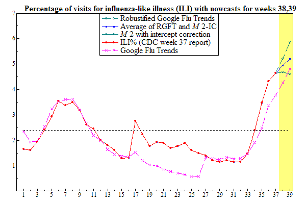 Google Flu Trends estimates ILI% for week 37 at 3.8.