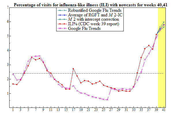 Google Flu Trends estimates ILI% for week 38 at 4.9.
