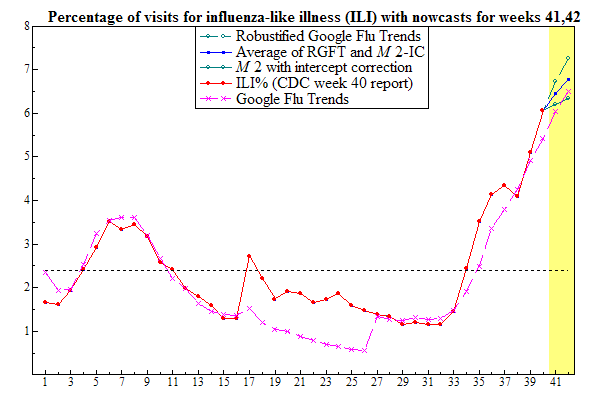 Based on the continuation of growth in ILI%, the M2 week 41 nowcast is 6.2%,
