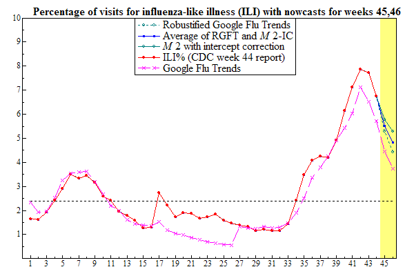 The average nowcasts for week 45 and 46, based on pooling a dynamic model with